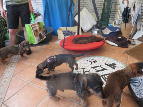 Für Giacomo war es Familienbesuch: Mama Cheyenne, Halbschwester Flugsvinn, Onkel Diego, Oma Antonia. Einen Rüden hat der Dackelhaushalt auch noch, und zwar den Ambrosius, einen alten Freund von Basti, dem ersten und hoch und vielgelobten Dackel in unserem Haus. Ja, und nicht zu vergessen. Miss Marple, die aber erst am Samstag mit ihrem Herrchen aus Norderney kommen sollte. Aber davon ahnten wir noch nichts.